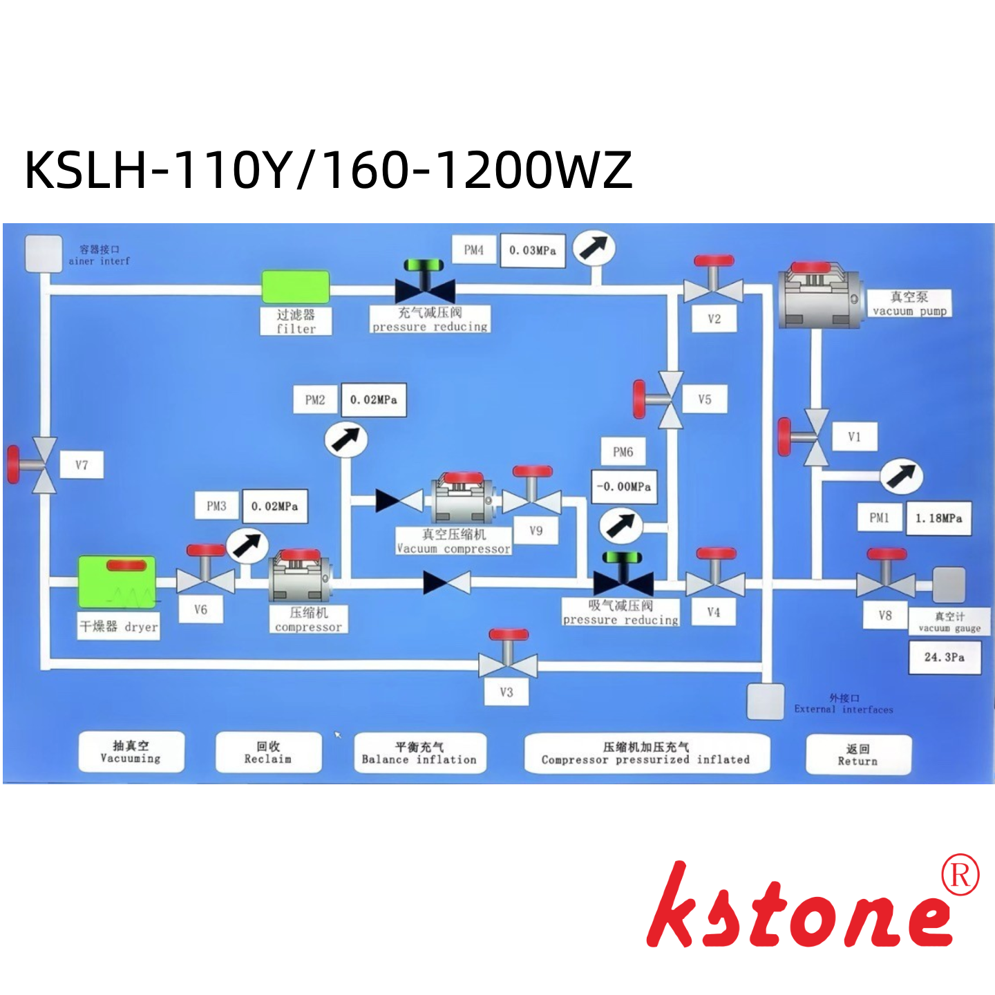Hệ thống tự động hóa công suất cao KSLH-110Y/160-1200WZ đã được tối ưu hóa để chịu được thử nghiệm điện áp của bể cách nhiệt 550kV trong lưới điện.Nó tích hợp một máy nén chính piston không dầu 110m3/h, một máy nén áp suất âm 160m3/h (≤ 5Pa chân không tối đa), một máy bơm chân không đường ống 63m3/h (≤ 5Pa chân không tối đa) và một bể lưu trữ ngang 1200L thép không gỉ 304,bể lưu trữ thép cacbon (không cần thiết), để quản lý hiệu quả SF6 áp suất cao.